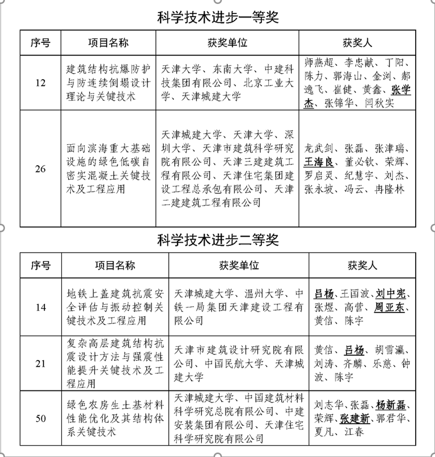 近日,天津市人民政府办公厅发布了《天津市人民政府关于颁布2021年度天津市科学技术奖的决定》。我院共有5项科技成果获奖,其中我院教师牵头获科技进步二等奖1项,参与获科技进步一等奖2项、二等奖2项。获奖名单如下: