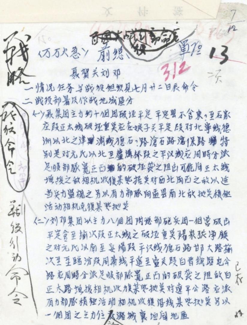 1940年8月8日,《朱德、彭德怀、左权关于破击正太路的战役部署》(中央档案馆 藏)
