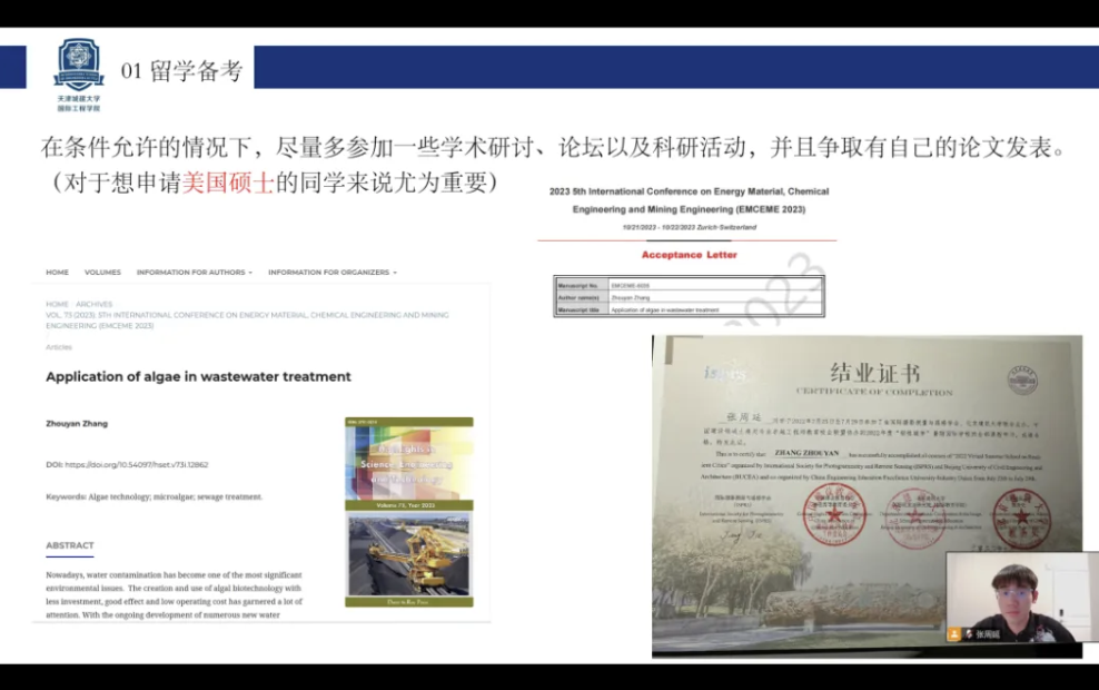 活动开始,由2020届环境工程专业优秀毕业生校友张周延开展线上宣讲。张周延目前在宾夕法尼亚大学攻读环境专业硕士学位,通过视频连线与大家分享了留学申请的策略与技巧。他强调了提前规划出国留学的重要性,建议同学们在申请前要明确了解目标院校和专业的录取要求,制定个性化的申请计划。同时,张周延用中英分享了自己在美国的学习和生活体验、留学申请过程中遇到的挑战和克服方法,包括如何平衡学业和生活、参与校园活动等,在同学们提供了宝贵的参考。