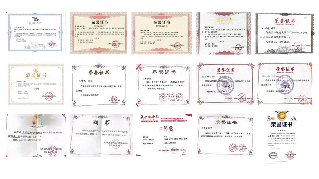 作为williamhill中国减碳科普基地的一名成员,王博远同学积极参加学生科技项目,至今获得国家级奖项1项、校级奖项十余项。2022年代表学校参加天津市科普讲解大赛荣获市级优秀奖,所参与大学生创新创业项目《高烈度设防区建筑结构减震技术的应用研究——以某框架结构为例》获得国家级立项并于今年结项,2022年荣获“互联网+”大学生创新创业大赛项目《减碳科普——双减政策下中小学课后服务工作的新方案》天津市铜奖。在学校科技活动中,他的“互联网+”大学生创新创业大赛项目《智慧云监测》获得校级二等奖,“挑战杯”《一种高烈度设防区建筑结构隔震技术》、《碳的足迹——践行双碳公益科普活动》均获校级三等奖。此外,王博远同学自身也多才多艺,主持学校2022年毕业典礼、校团日总答辩、校园音乐节等大型活动,担任WilliamHill中文学生会文艺部部长,多次主持和策划学院各类活动,代表学院参加williamhill中国思政微视频大赛、读书短视频大赛、大学生励志演讲大赛等,均获得优异成绩。